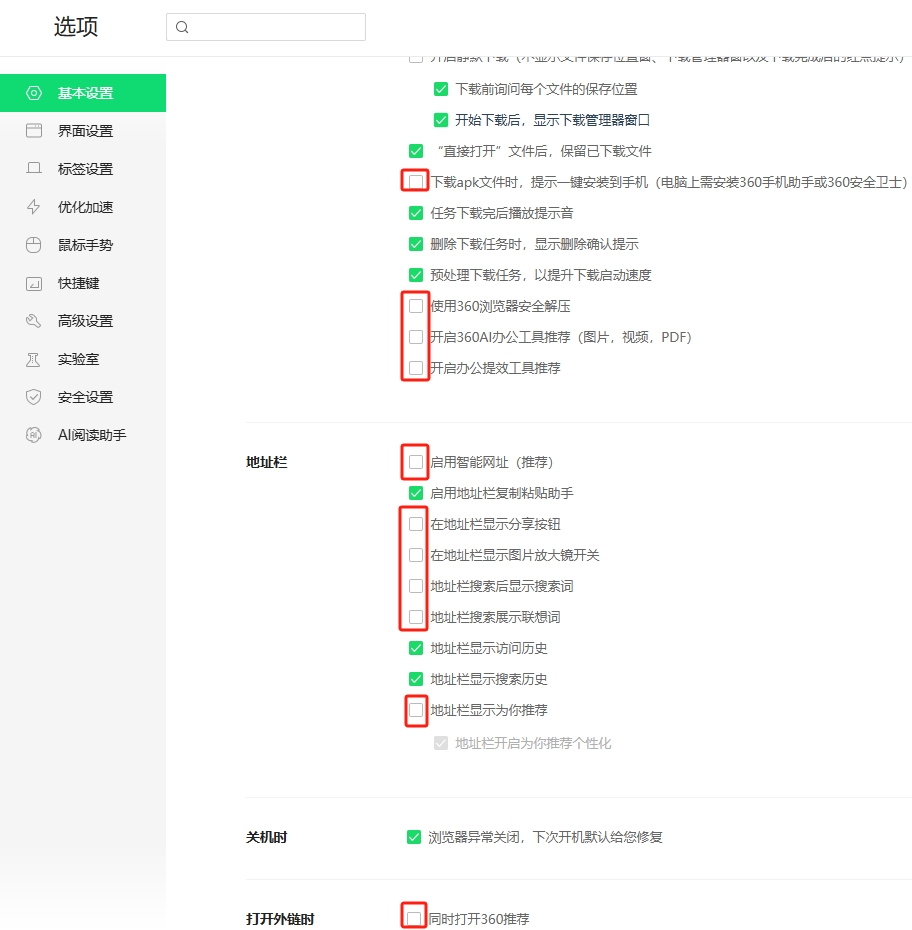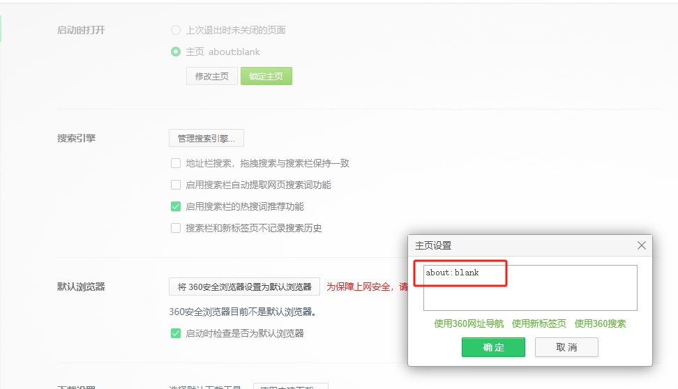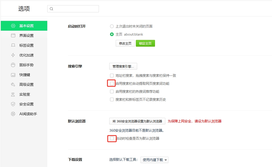 接下来把启动搜索栏自动提取网页搜索词功能、启动时检查是否为默认浏览器等选项取消勾选