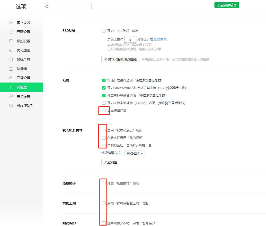 接下来点击左侧菜单“实验室”,把下图中红色选项全部勾选取消掉