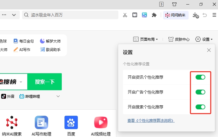 安装完成之后,打开360广告浏览器,点击界面中的设置,开启资讯个性化推荐、广告个性化推荐、搜索个性化推荐什么的都关闭。